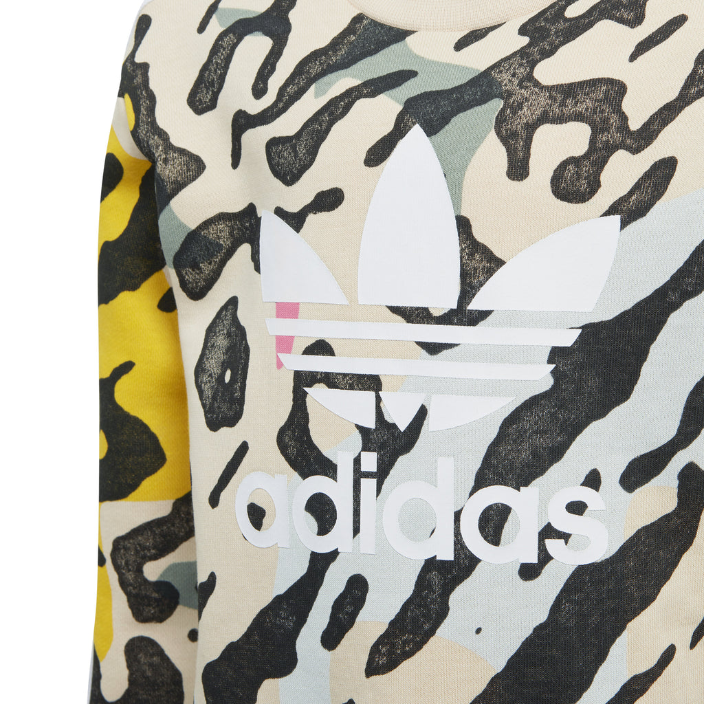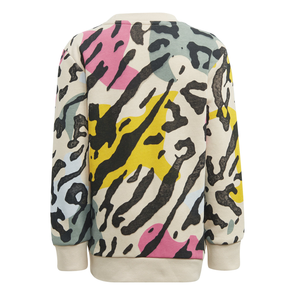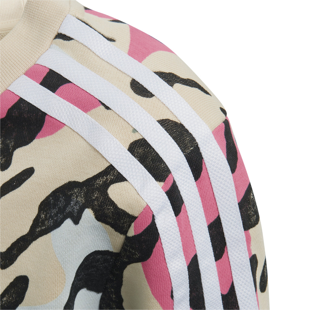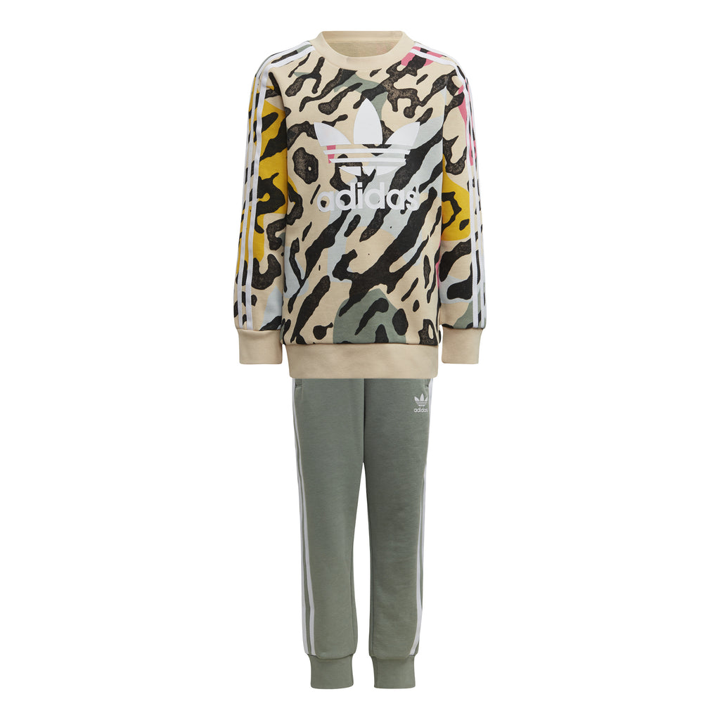 Treningul pentru copii Adidas Originals cu animal print va fi pe placul oricarui copil. Acest set vibrant, inspirat de anii '80, afiseaza un design salbatic, captivant. Celebrele trei dungi Adidas autentifica stilul si calitatea produsului. Fabricat din tricot neted, acest set asigura confort in toate momentele, fie ca sunt linistite sau pline de energie. Realizat din materiale reciclate 100%, acest produs evidentiaza angajamentul brandului de a reduce deseurile din plastic. Setul colorat, compus din doua piese, este confectionat din materiale reciclate. Croiala se potriveste lejer oricarei siluete. Bluza este prevazuta cu inchidere cu fermoar si guler bomber cu nervuri. Atat topul, cat si pantalonii au buzunare laterale cu fermoar si mansete si tivuri cu nervuri.